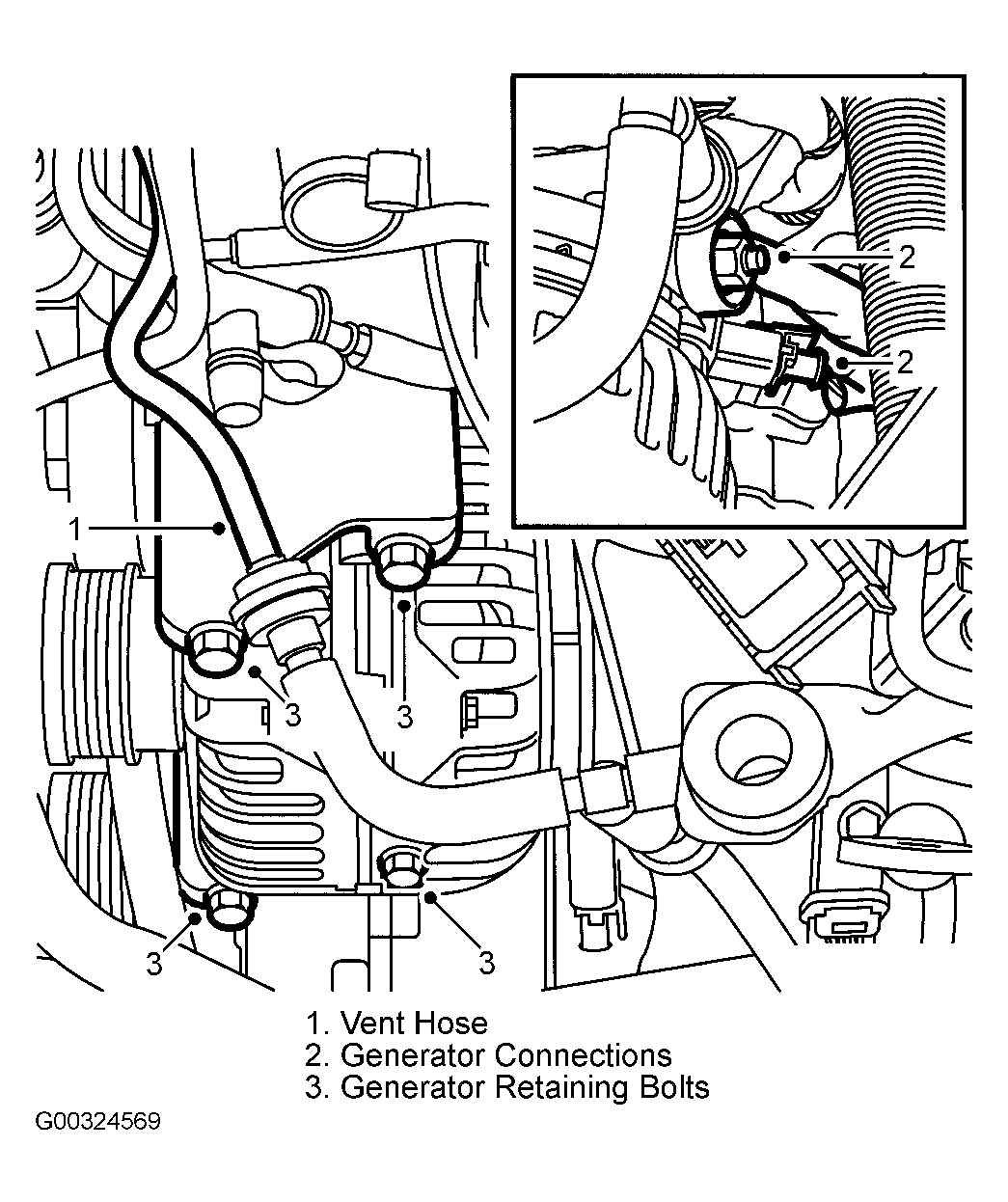- Detach the vent hose from the air hose to the throttle body and loosen the fastener in the camshaft cover. Bend aside the vent hose. Detach the generator connections. See Fig 6 .