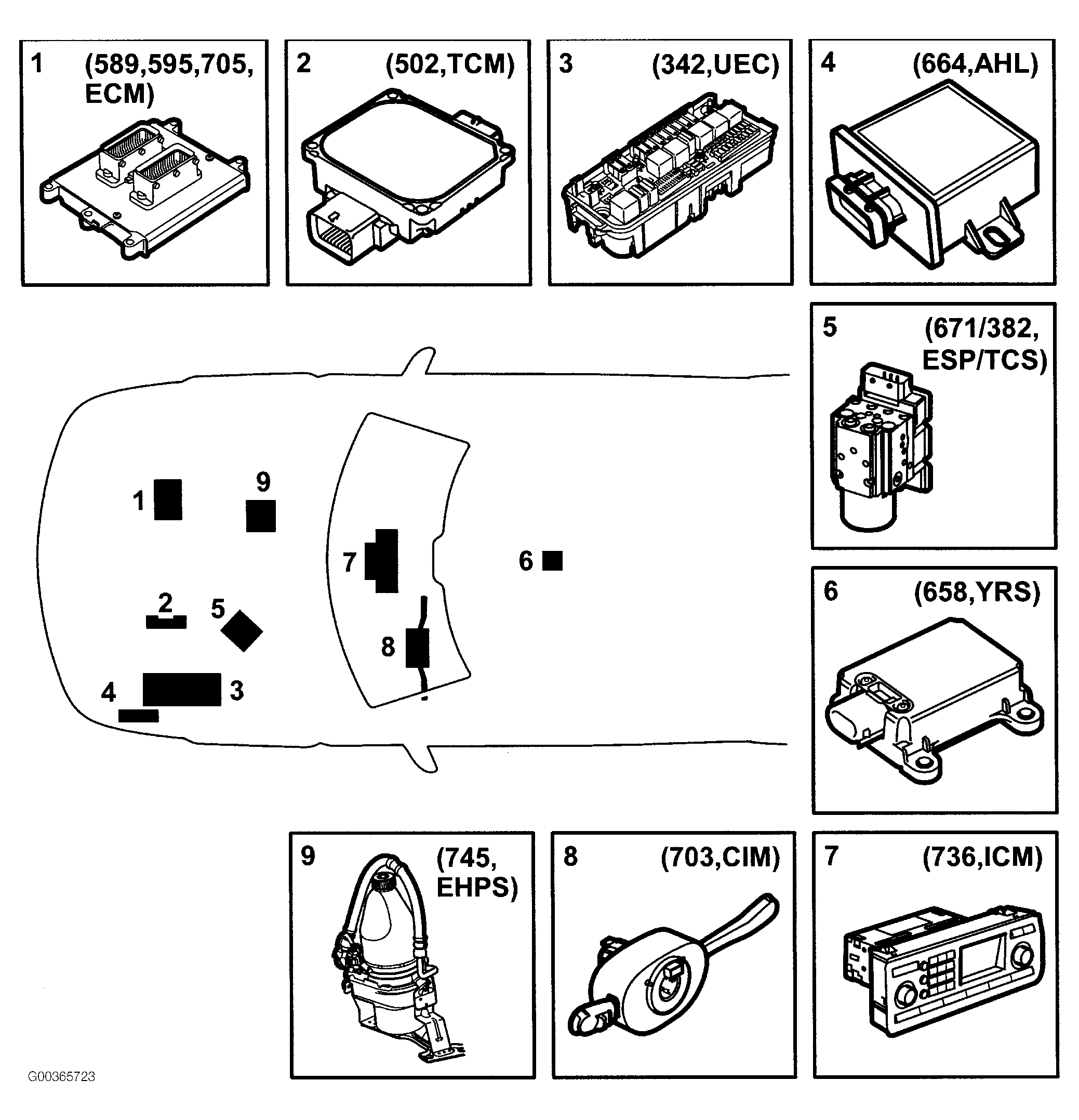 | ESP/TCS (Control Module) (5) | Integral to hydraulic unit, at left rear corner of engine compartment. See Figure . |