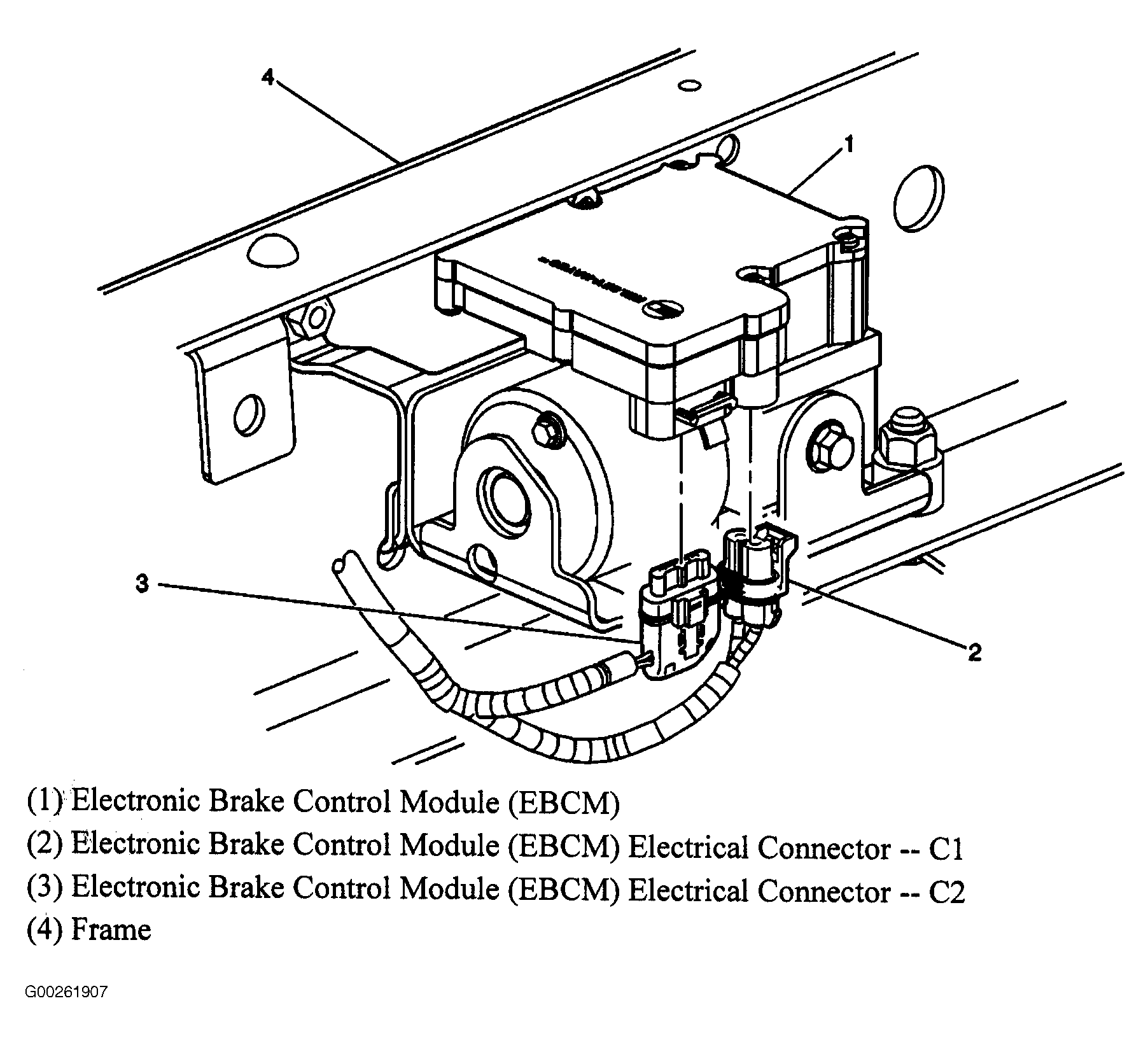 | Electronic Brake Control Module (EBCM) | On inner left frame rail, beside transmission. See Figure . |