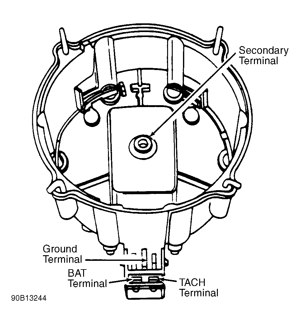 1. Turn ignition off. Remove distributor cap and coil assembly. Invert cap. See Fig 1. Set ohmmeter to low scale. Connect leads to coil BAT and TACH terminals. Resistance should be zero or nearly zero. If resistance is not zero or nearly zero ohms, replace ignition coil.