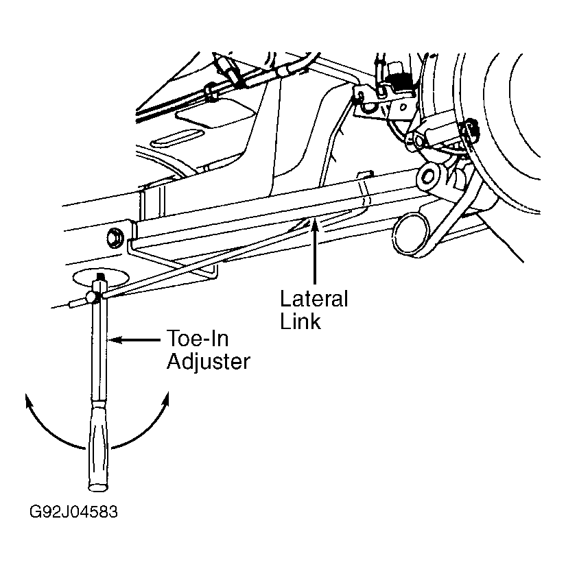 Loosen rearmost inboard lateral link at rear wheel. Using Toe-In Adjuster (SA9158S), move lateral link to obtain desired toe-in setting. See Fig 1 . Tighten lateral link bolt to specification. See TORQUE SPECIFICATIONS table.