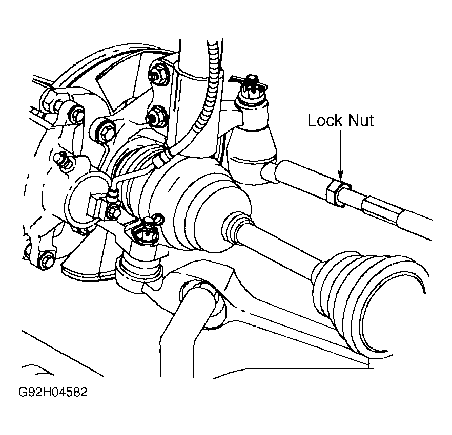 Lock steering wheel in straight-ahead position. Loosen tie rod end lock nut. See Fig 1 . Loosen steering gear dust boot clamp(s) at tie rod end. Turn tie rod end to obtain correct toe-in. Tighten lock nut to specification. See TORQUE SPECIFICATIONS  . Ensure steering gear dust boot is straight after adjustment. Tighten dust boot clamp.