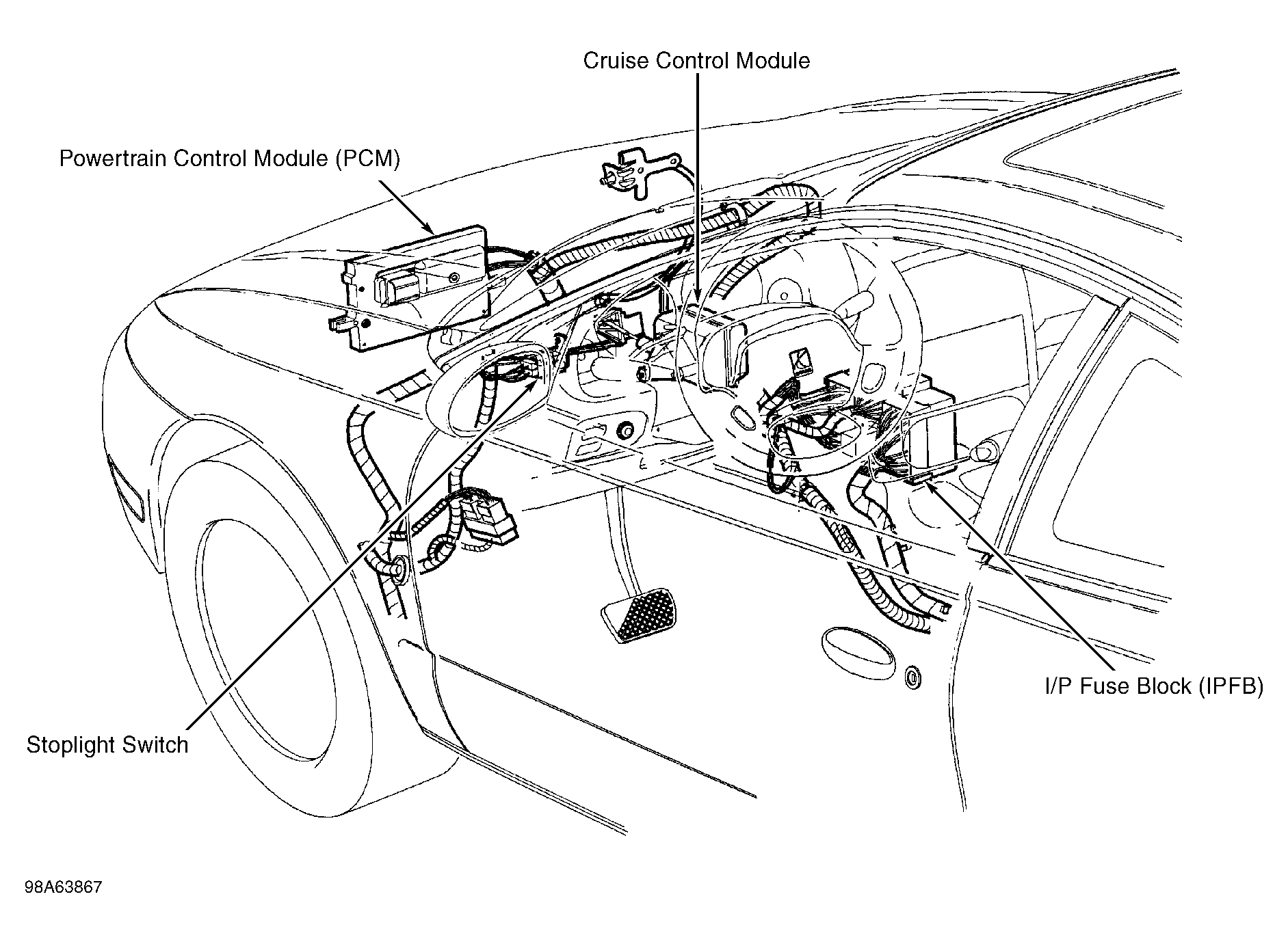 Powertrain Control Module (PCM) Between battery & power brake booster. See Figure.