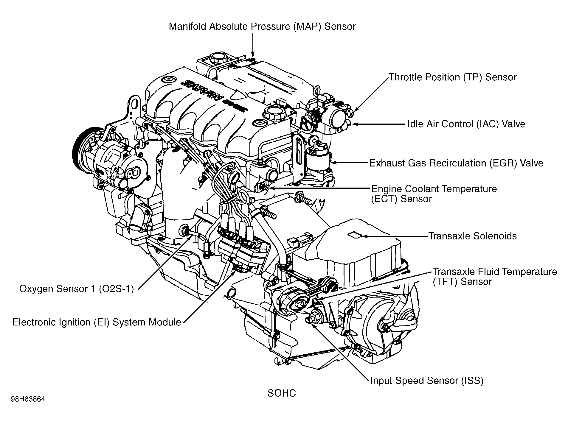 Electronic Ignition (EI) System Module (SOHC) On left front side of transaxle housing. See Figure.
