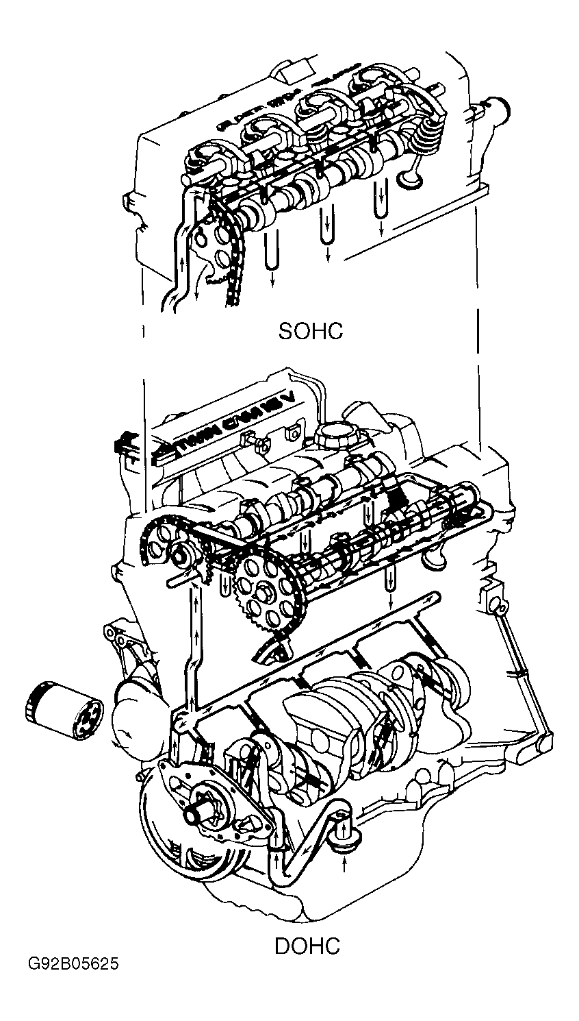 Oil is pressurized by oil pump on front cover and routed through oil filter to main oil gallery. See Figure. Main oil gallery runs full length of cylinder block and supplies oil to crankshaft and camshaft feed passage. Oil is also routed to timing chain tensioner to maintain timing chain tension.
