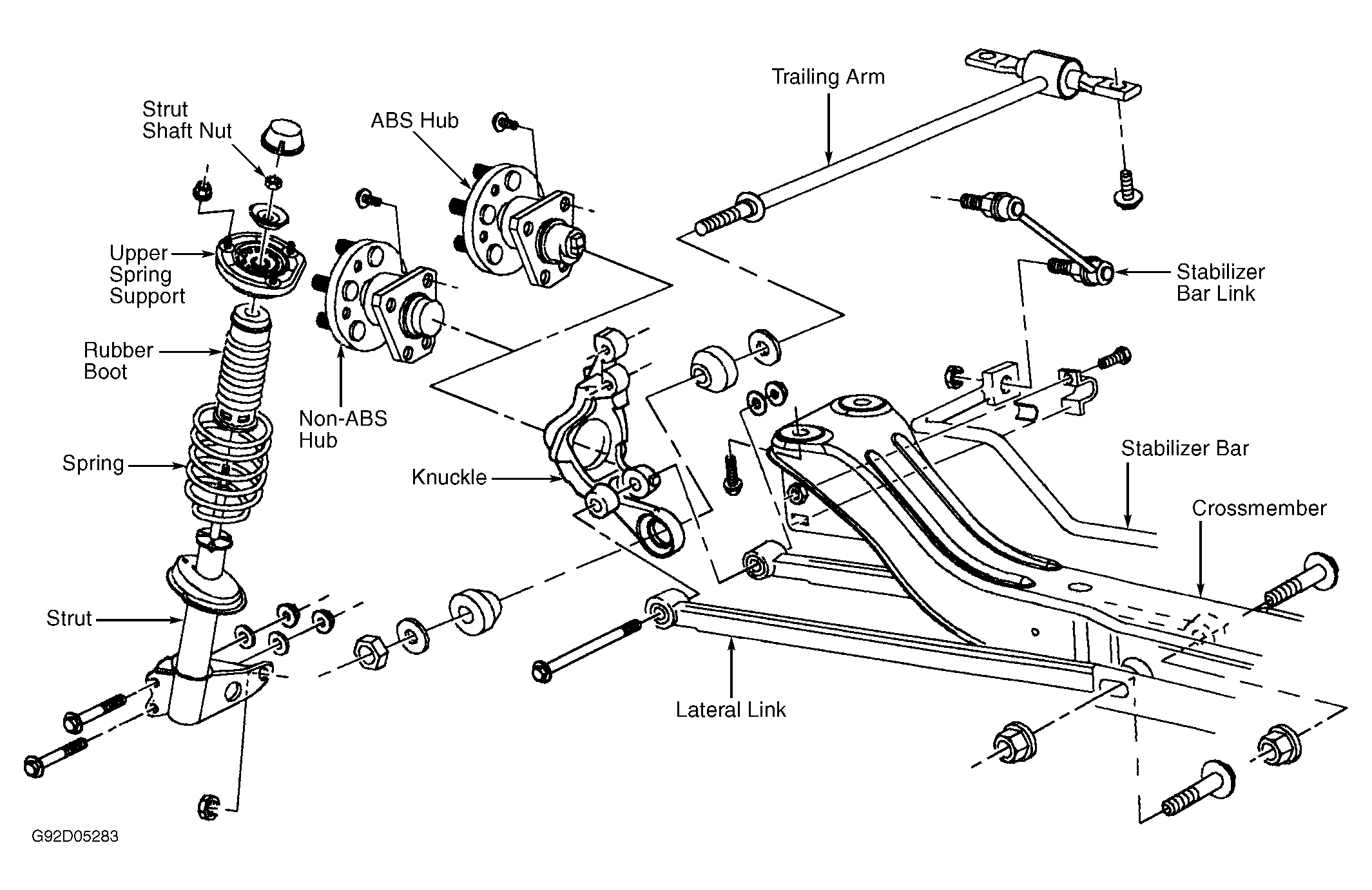 Saturn uses a MacPherson strut type rear suspension. See Fig 1 . Strut assembly is connected to the vehicle at three locations. The top is connected to the vehicle body. The bottom is connected to the crossmember through the knuckle and lateral links. The bottom is also connected to the vehicle body through a trailing arm. The strut is not serviceable and must be replaced.