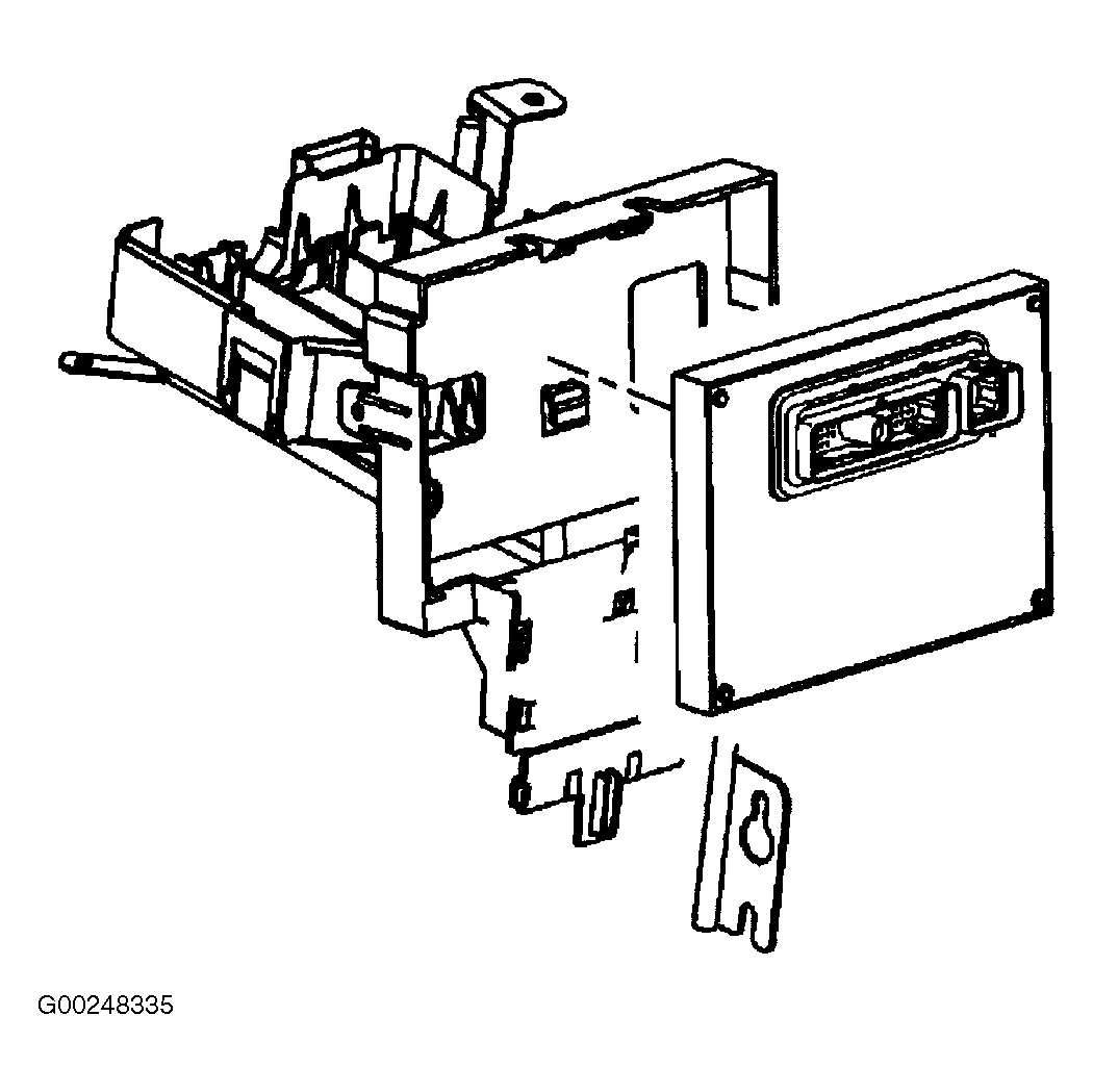- Use the retaining tab to release the ECM from the underhood junction block bracket. See Figure .