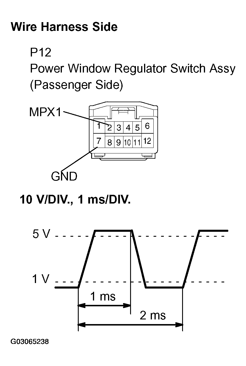 REGULATOR SWITCH (PASSENGER SIDE) REFERENCETester Connection P12-2 (MPX1) - P12-7 (GND) Tool Setting 10V/DIV, 1 ms/DIV. Condition Operating passenger side switch on master switch