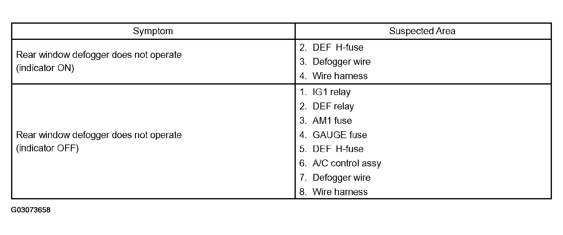 Use the table shown in Fig 1to help determine the cases of the problem symptom. The potential causes of the symptoms are listed in order of probability in the "Suspected Area" column of the table. Check each symptom by checking the suspected areas in order they are listed. Replace parts as necessary.