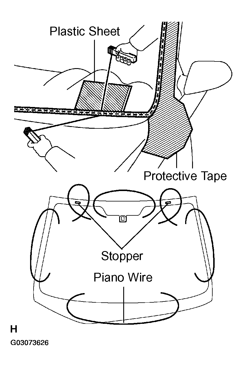 - Cut through the adhesive by pulling the wire around the glass.NOTE: Leave as much adhesive on the vehicle body as possible when cutting through the adhesive.