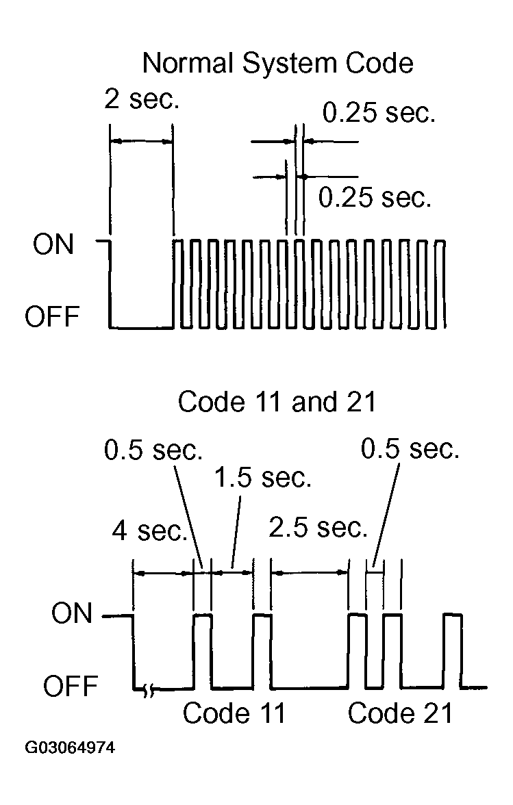 Trouble Area Refer To TC terminal circuit TC TERMINAL CIRCUIT ABS warning light circuit ABS WARNING LIGHT CIRCUIT (REMAINS ON) - As examples, the blinking patterns for a normal system code and trouble codes 11 and 21 are shown in Fig 2 .