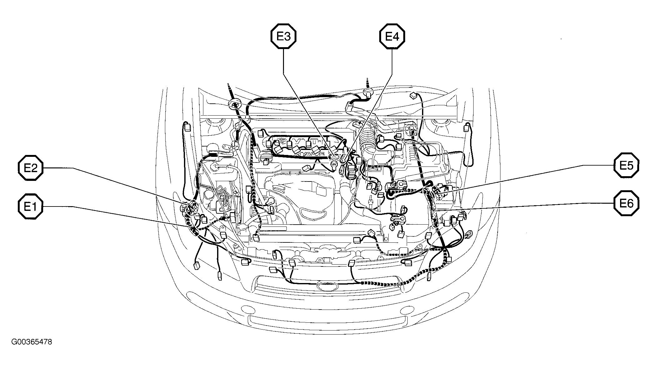 E2 In engine harness, right front of engine compartment. See Figure.