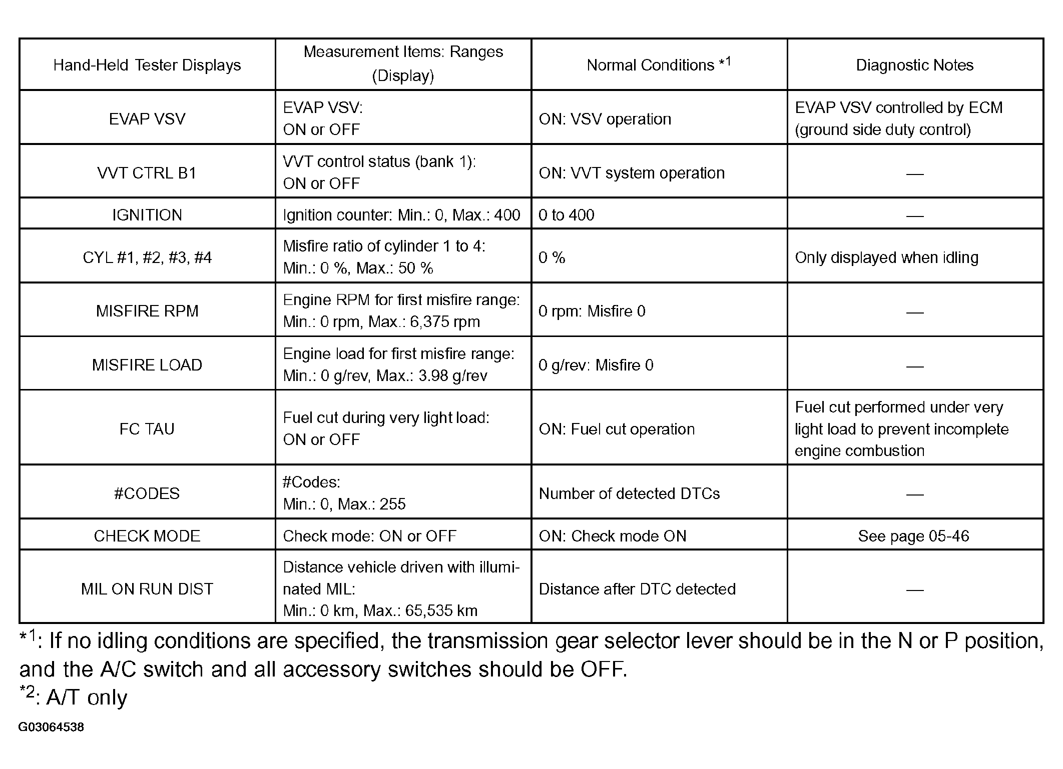 NOTE: In the table below, the values listed under Normal Conditions are for reference only. Do not depend solely on these values when determining whether or not a part is faulty.- Warm up the engine.