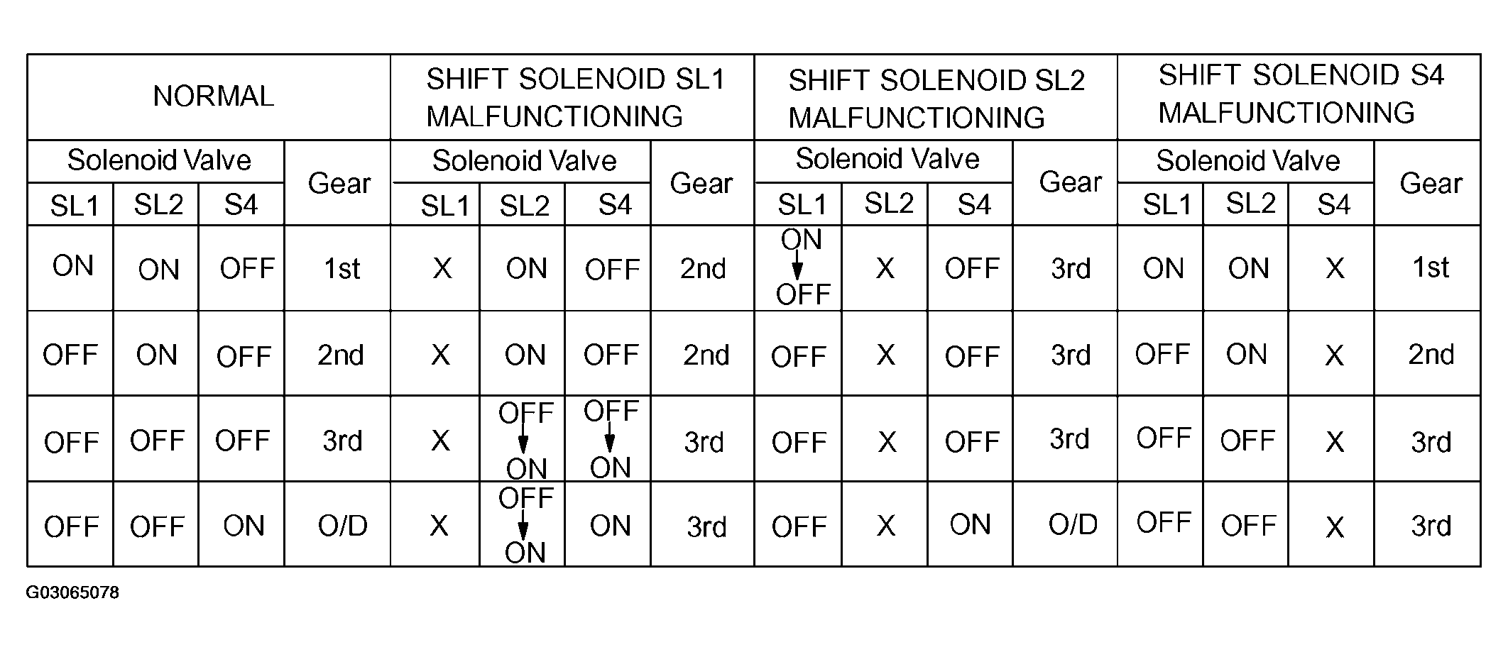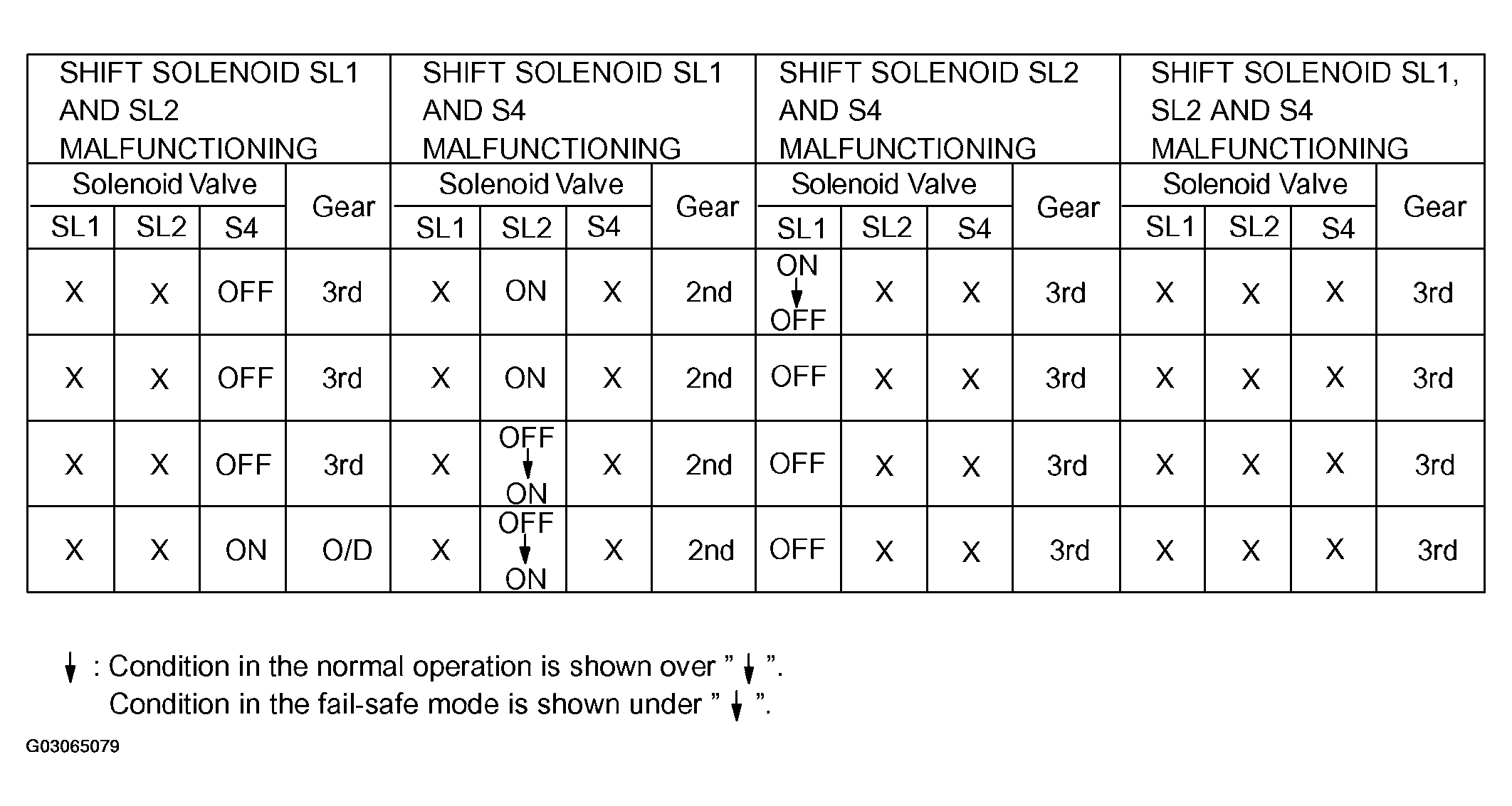 If either of the shift solenoid valve circuits develops an open or short, the ECM turns the other shift solenoid "ON" and "OFF" in order to shift into the gear positions shown in Fig 1 & Fig 2 .