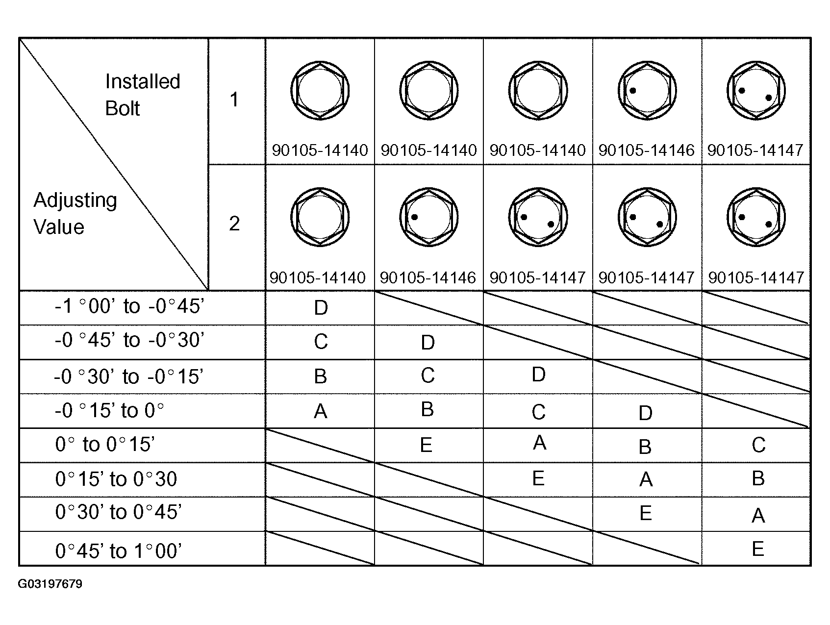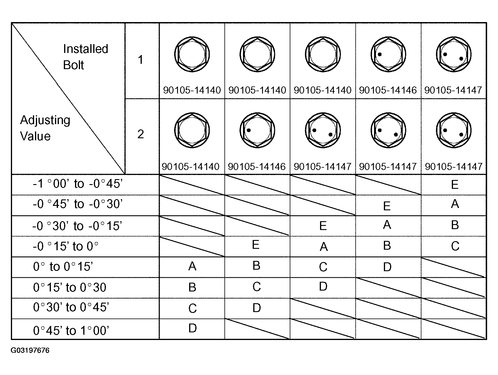Check installed bolts combination. Select appropriate bolts from the table below to adjust the camber to within the specified range.