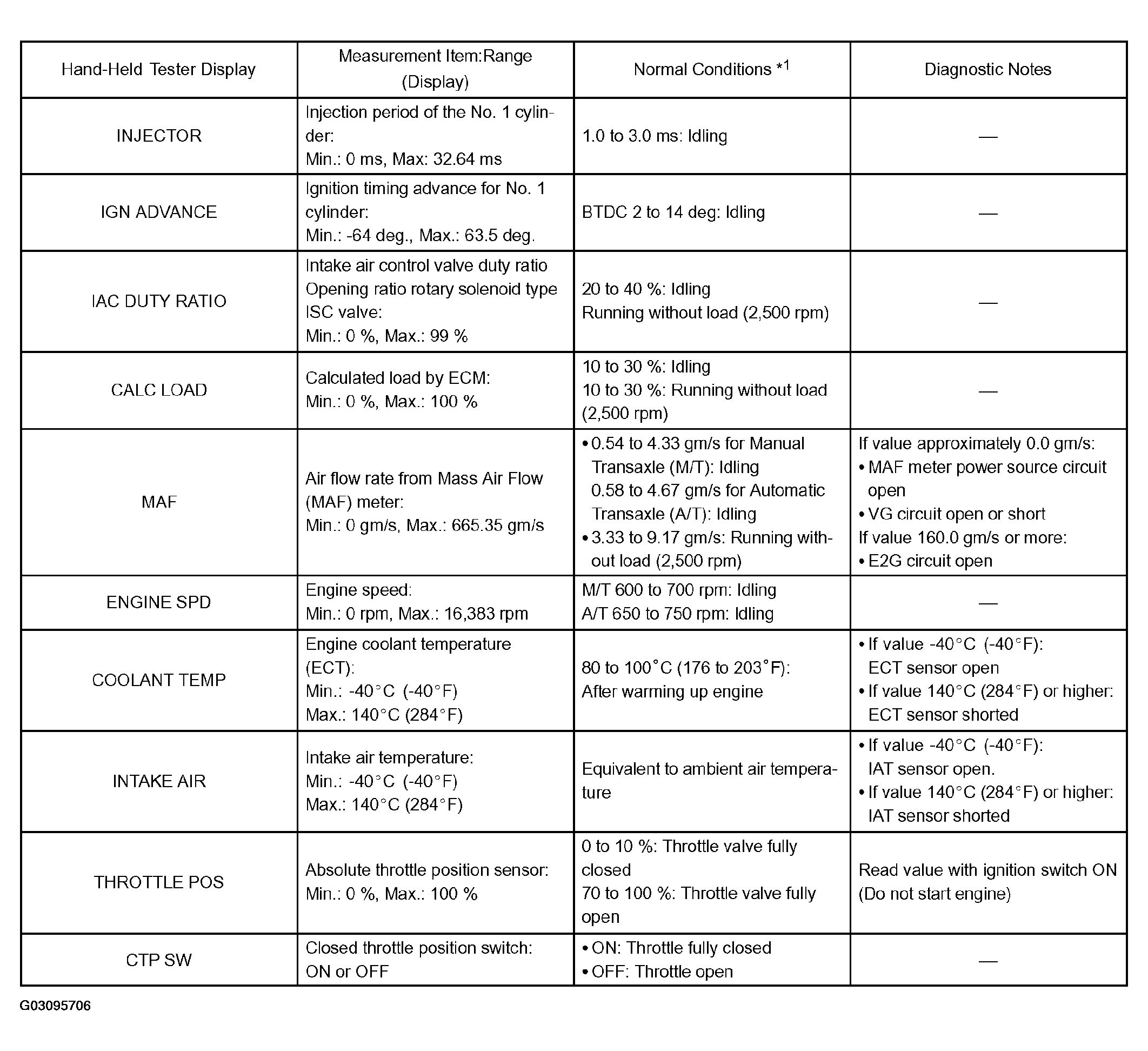 NOTE: In the table below, the values listed under Normal Conditions are for reference only. Do not depend solely on these values when determining whether or not a part is faulty.- Warm up the engine.