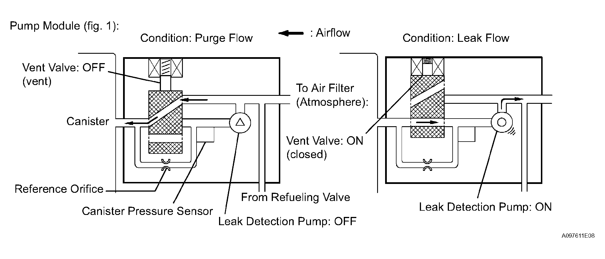 The leak detection pump creates negative pressure (vacuum) in the EVAP system and the pressure is measured. Finally, the ECM monitors for leaks from the EVAP system and malfunctions in both the canister pump module and purge VSV, based on the EVAP pressure.