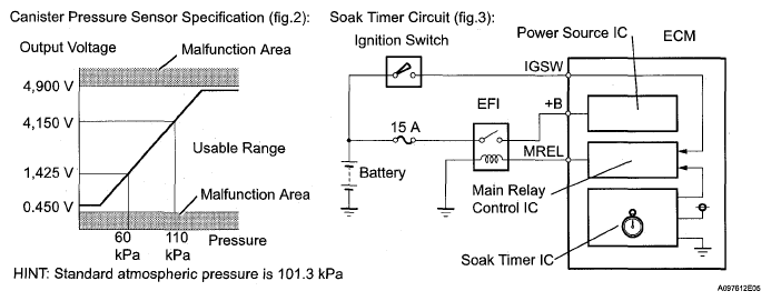 Soak timer Built into ECM. To ensure accurate EVAP monitor, measures 5 hours (+-15 min) after engine switch is turned off. This allows fuel to cool down, stabilizing EVAP pressure. When approximately 5 hours have elapsed, ECM is activated (refer to Fig 6).
