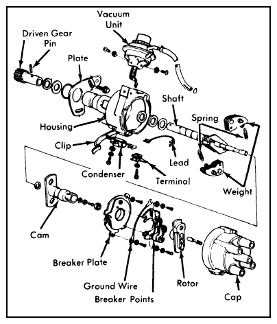 Disassemble distributor using illustration as a guide. See Figure. Mark position of driven gear (or coupling) on shaft for reassembly reference. Note position of cam, springs and weights on distributor shaft.