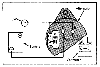 1. Connect a voltmeter and leads to battery as shown in Fig 1. Operate the alternator and turn off the switch "SW" when alternator speed reaches approximately 800 RPM. Increase speed in small increments while watching voltmeter deflection and read alternator speed when at 14 volts. Speed should be approximately 1000 RPM.
