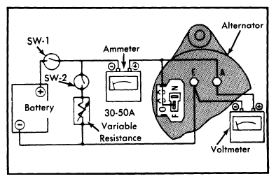 2. Make test connections using a 30-50 ampere variable resistor, battery, ammeter, and voltmeter as shown in Figure. Operate alternator with switch "SW-1" closed. When alternator speed reaches approximately 800 RPM, set the variable resistor to maximum and turn on switch "SW-2". Increase alternator speed while maintaining a constant 14 volts by adjusting resistance. Read current at 2500 RPM and 5000 RPM. Readings should be 37-43 amperes at 2500 RPM and 48-54 at 5000 RPM.