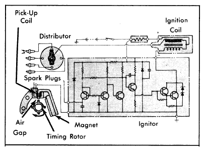 As the timing rotor turns with the distributor shaft, its teeth (one for each engine cylinder) pass the pick-up coil assembly. See Fig 1. As the air gap changes with the passing of the teeth, the magnetic field varies creating a signal in the pick-up coil assembly.