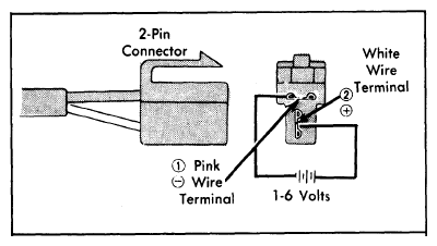 1. Turn ignition on. Connect negative lead of a voltmeter to ground and positive lead (in turn) to terminals "a" and "b". One reading should be battery voltage, the other one-half that voltage. See Figure. If so, go to step  8).