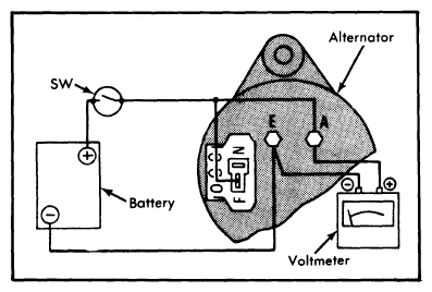 1. Connect a voltmeter and leads to battery as shown in Fig 1. Operate the alternator and turn off the switch "SW" when alternator speed reaches approximately 800 RPM. Increase speed in small increments while watching voltmeter deflection and read alternator speed when at 14 volts. Speed should be approximately 1000 RPM.