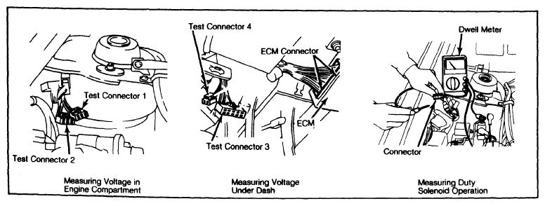 Disconnect all wiring harness connectors when measuring component resistance. When measuring voltage, connectors must remain hooked up. Use diagnostic test connectors to make measurements. See Fig 1.