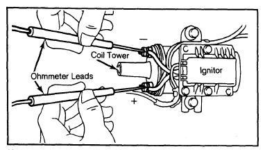 Isolate coil from remainder of system. Connect an ohmmeter, set in x1 range, so leads touch coil positive and negative primary terminals. See Fig 1and Ignition Coil Resistance table.