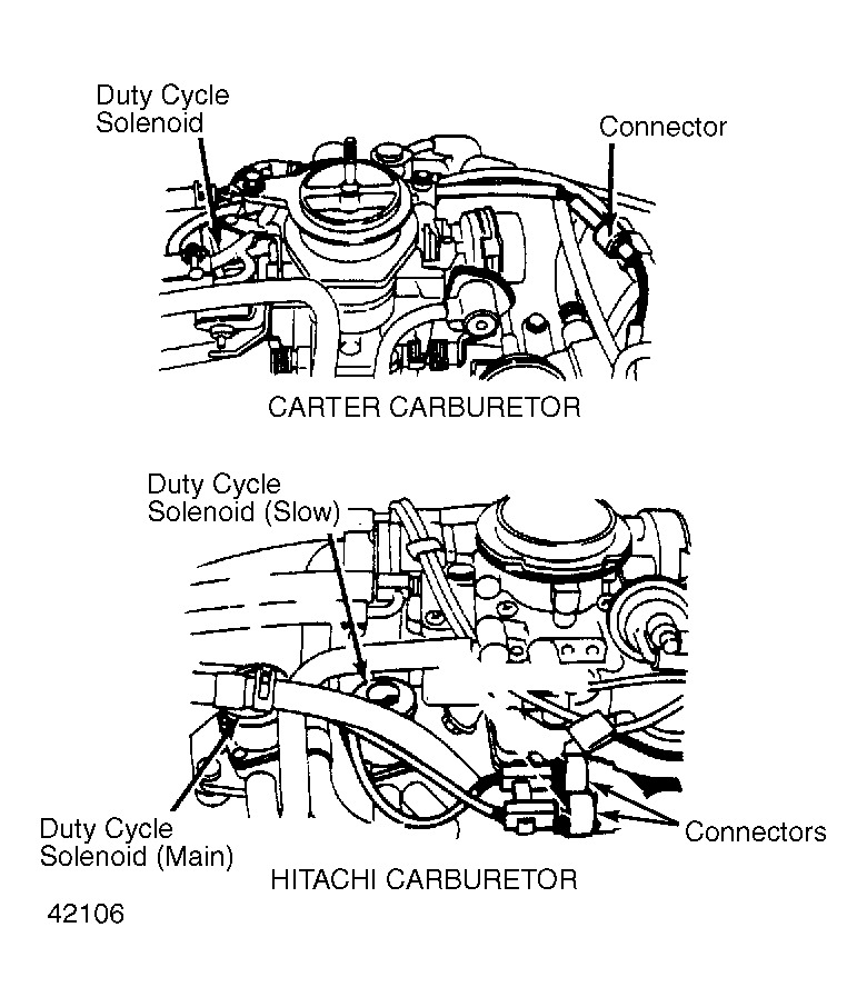 Models equipped with Carter carburetors use 1 solenoid and models with Hitachi carburetors use 2 solenoids (slow and main circuits). The solenoid for Carter carburetors is an integral part of carburetor. The solenoids for Hitachi carburetors are externally mounted on intake manifold and are connected to the carburetor by air hoses. See Fig 1 .