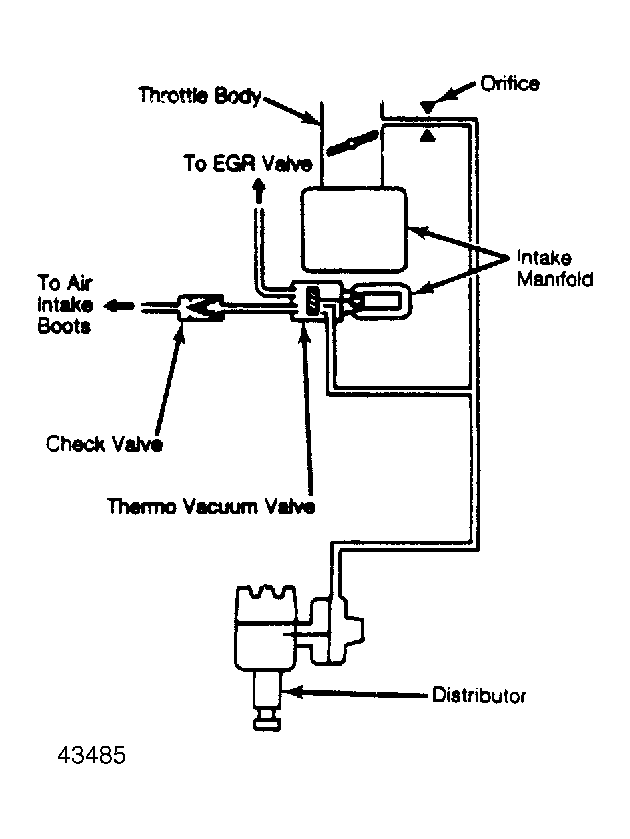 When intake manifold temperature is 59-122°F (15-50°C), thermo vacuum valve I vents distributor vacuum line to atmosphere so no vacuum advance is applied. When engine is below or above these temperatures, vacuum is obtained from a throttle port above throttle valve and is applied to vacuum advance unit. See Fig 1 .