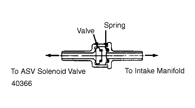 By blowing into check valve, ensure there is no air flow from the intake manifold side to the ASV solenoid valve side. Turn valve around. By blowing into check valve, ensure there is air flow from the ASV solenoid side to the intake manifold side. See Fig 1 .