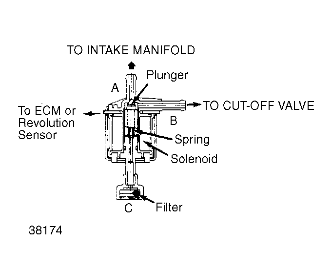 With current off, solenoid valve plunger is forced upward by spring pressure, closing off passage between "A" and "B" and opening passage between "B" and "C". With current on, plunger is attracted downward, opening passage between "A" and "B" and closing passage between "B" and "C". See Fig 1