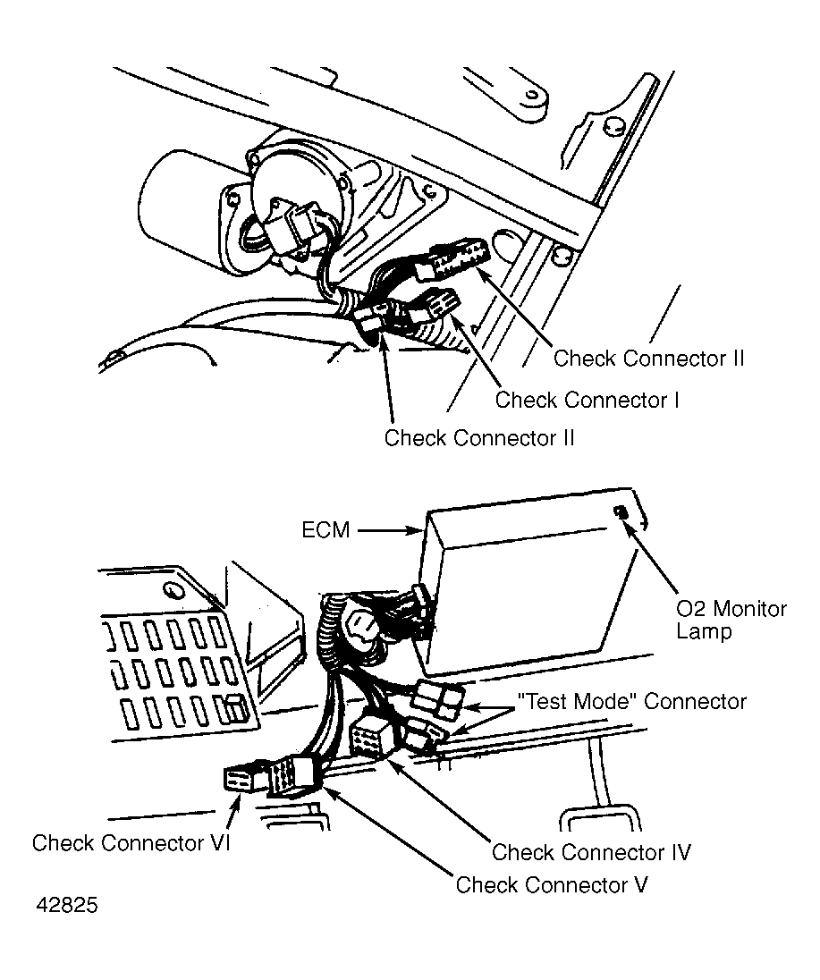 The ECC system requires a circuit tester, stethoscope and a dry cell battery for diagnosis. The circuit tester is used to measure voltage and resistance of check connectors I-VI. See Fig 1 and Fig 2 . It is also used to measure resistance of duty solenoids and vacuum sensor after lead connectors are unplugged. The stethoscope or vinyl tube is used to check operating sound from duty solenoid valves. The dry cell battery is used to test O2 sensor and its wiring for defects.