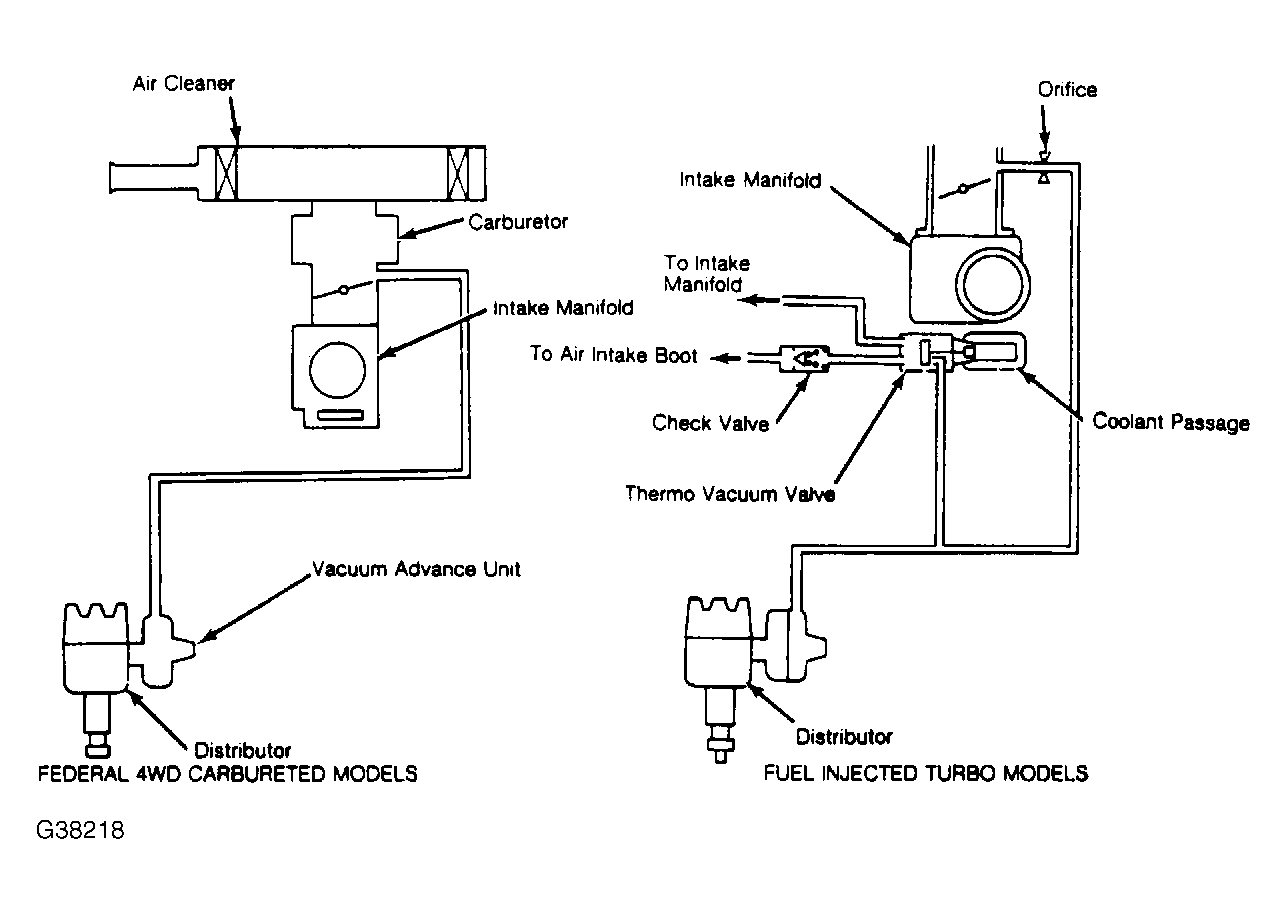 These vehicle are equipped with a single diaphragm advance unit. Vacuum pressure produced in the advance port is applied to the advance control unit in relation to opening angle of the throttle valve in order to provide an advance angle. See Fig 1 .
