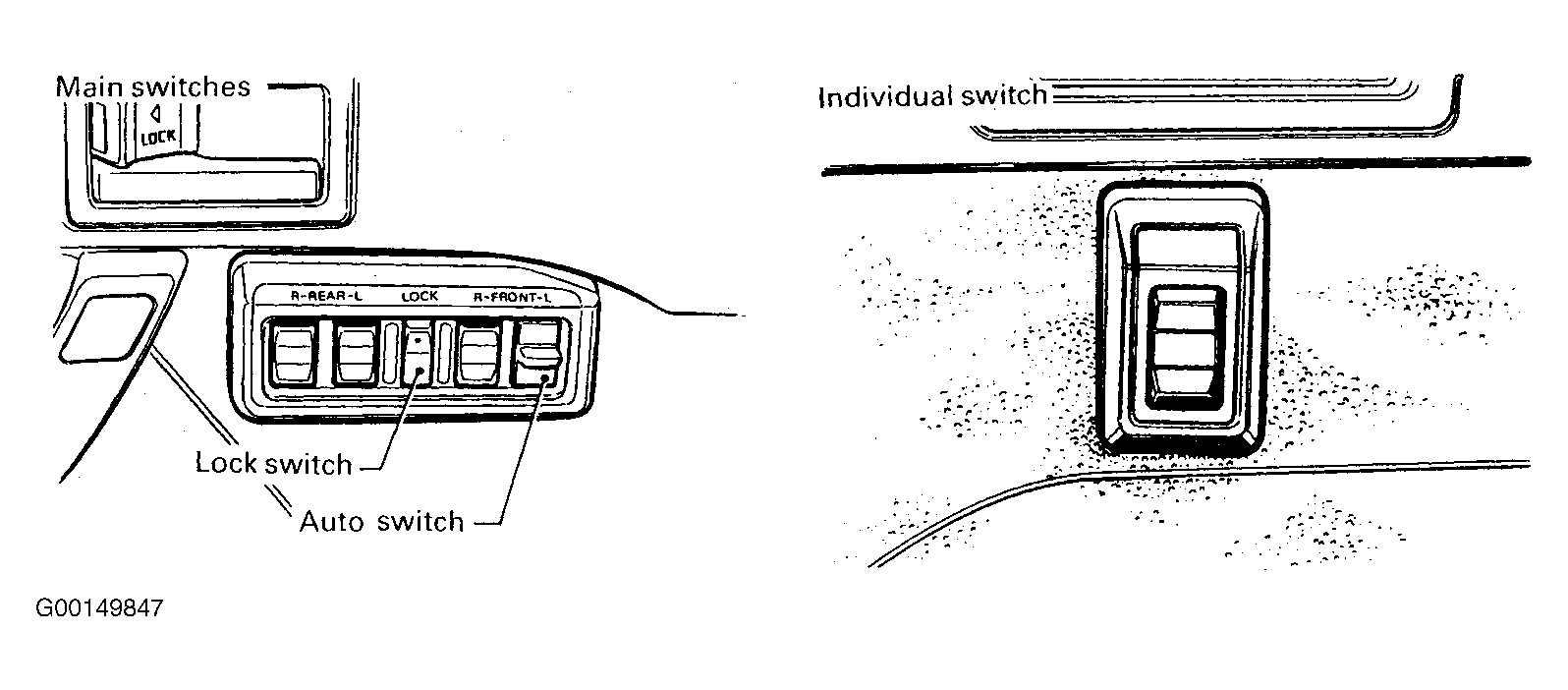 The main power window switch is located on the driver's door panel; it includes a one-touch switch that operates the driver's window. In addition, individual switches are located on each passenger door panel. The main switch has a lock-out feature that prevents passenger switches from operating. All power windows only operate when the ignition switch is turned to the ON position. See Figure .