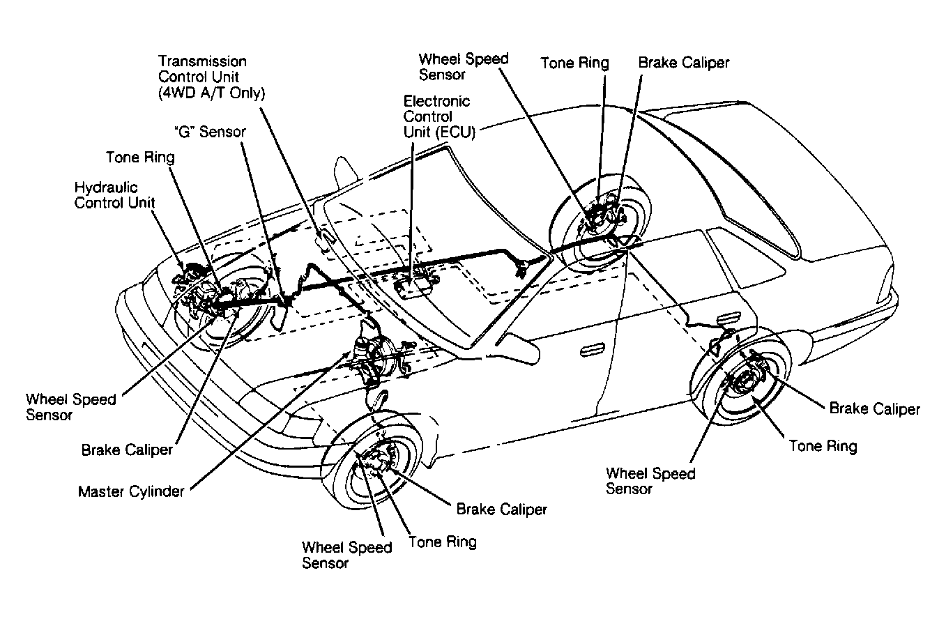 Anti-Lock Brake System (ABS) is designed to prevent wheel lock-up during heavy braking. Reducing chance of wheel lock-up allows driver to maintain better steering control of the vehicle. ABS system consists of 4 wheel speed sensors, 4 tone rings, ABS Electronic Control Unit (ECU), hydraulic control unit, "G" sensor (on 4WD models) and "ABS" warning light. See Figure .