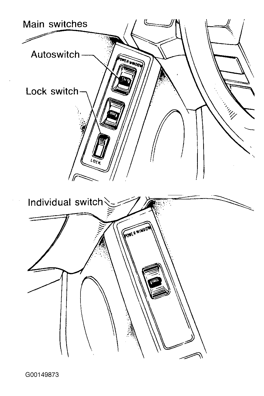 Main power window switches are located on the driver's door panel. Individual switch for passenger's use is located on the passenger's door panel. Power windows operate only when the ignition switch is turned ON. See Figure .