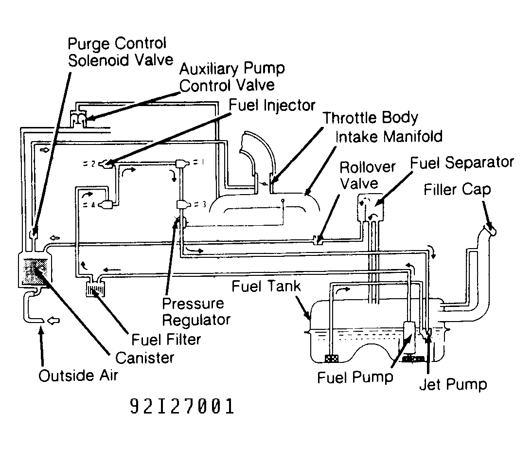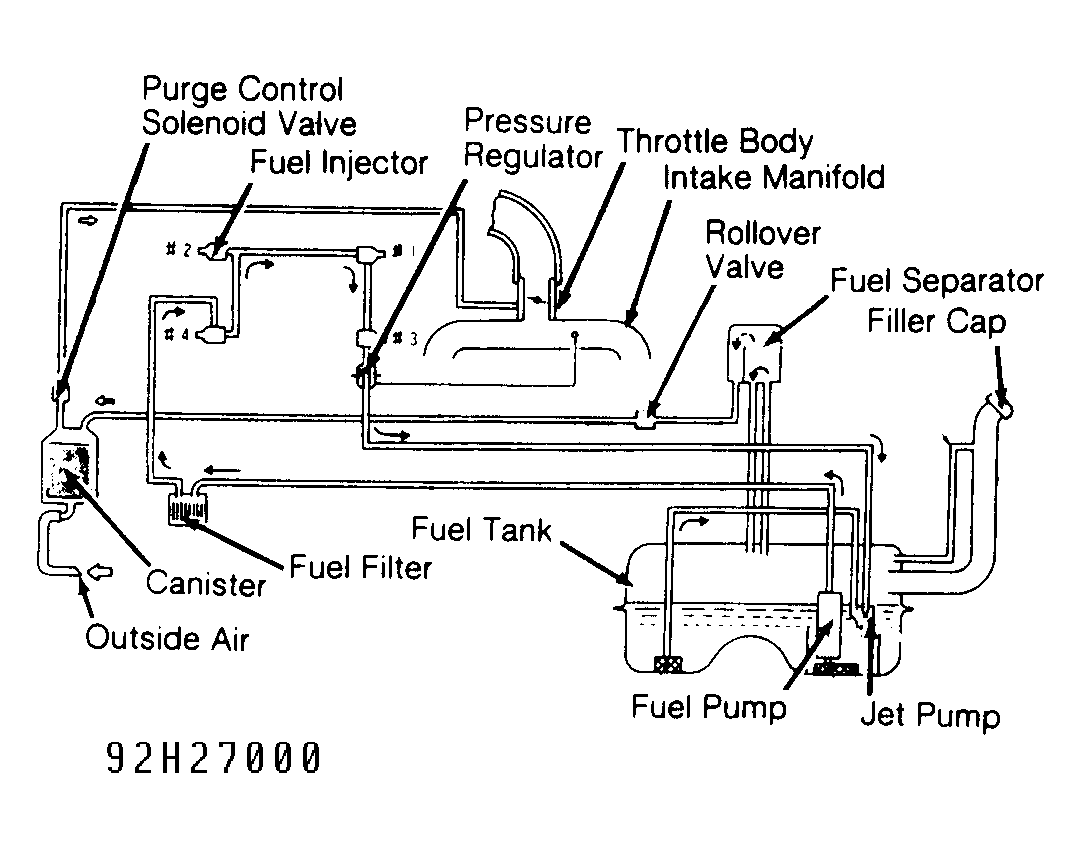 Remove fuel filler cap. Disconnect vent hose between charcoal canister and fuel tank. Blow air toward canister. Ensure air flows freely into canister. Blow air toward fuel tank. Ensure air flows into tank with a slight resistance from 2-way valve. See Fig 1