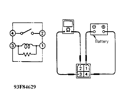 To access relay, remove passenger's seat. Remove cover side plate and roll up floor mat. Remove relay. Using ohmmeter, check continuity between relay terminals. SeeFig 1 . Continuity should exist between terminals No. 1 and 3. With battery voltage applied to terminal No. 3 and battery negative applied to terminal No. 1, continuity should exist between terminals No. 2 and 4.