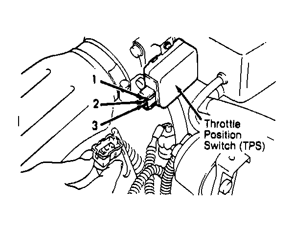 - With ignition off, unplug Throttle Position Switch (TPS) connector, located at throttle body. Measure and record resistance between terminals No. 2 and 3 with throttle fully closed, then with throttle fully open. See Fig 1 .