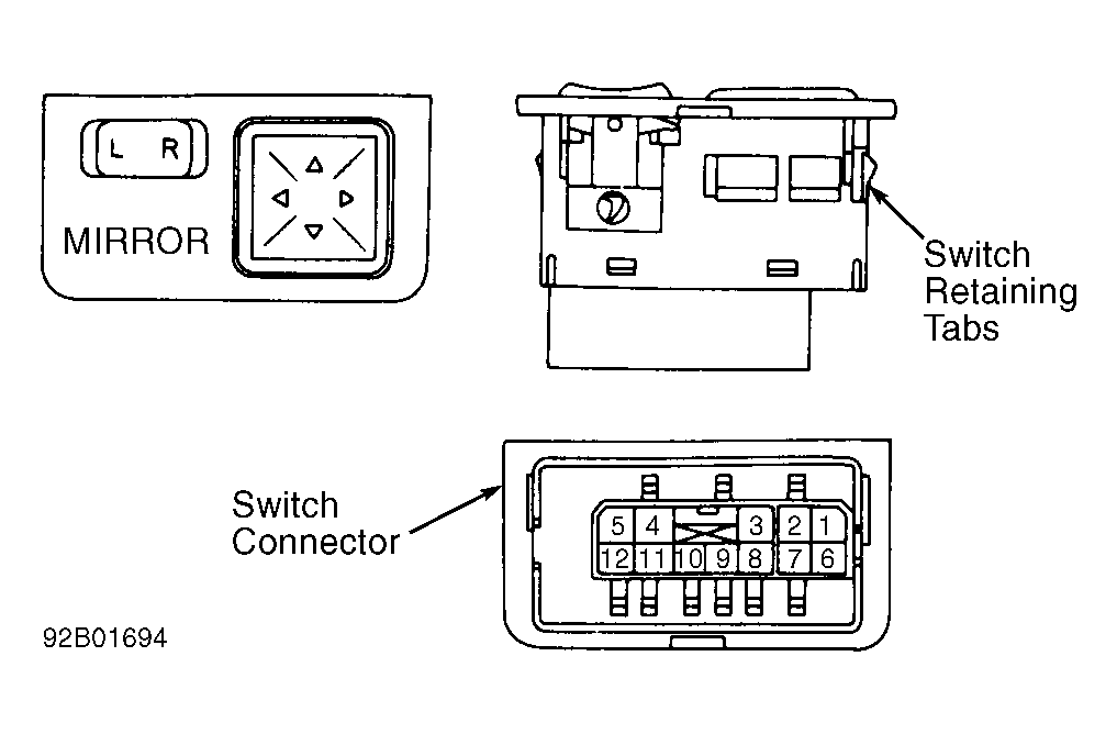 Pry mirror switch from instrument panel using a small screwdriver. Disconnect switch connector. Check continuity between specified terminals of switch connector with switch button in specified position. See POWER MIRROR SWITCH CONTINUITY TEST . SeeFig 1 . Replace switch if continuity is not as specified.