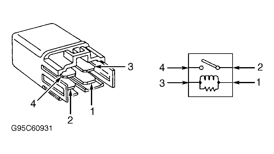Remove relay in question. Check continuity between terminals No. 1 and 3. See Fig 1 . See WIRING DIAGRAMS . Continuity should exist. Check continuity between terminals No. 2 and 4. Continuity should not exist. Connect battery voltage to terminal No. 1, and ground terminal No. 3. Continuity should now exist between terminals No. 2 and 4. Replace relay if continuity is not as specified.