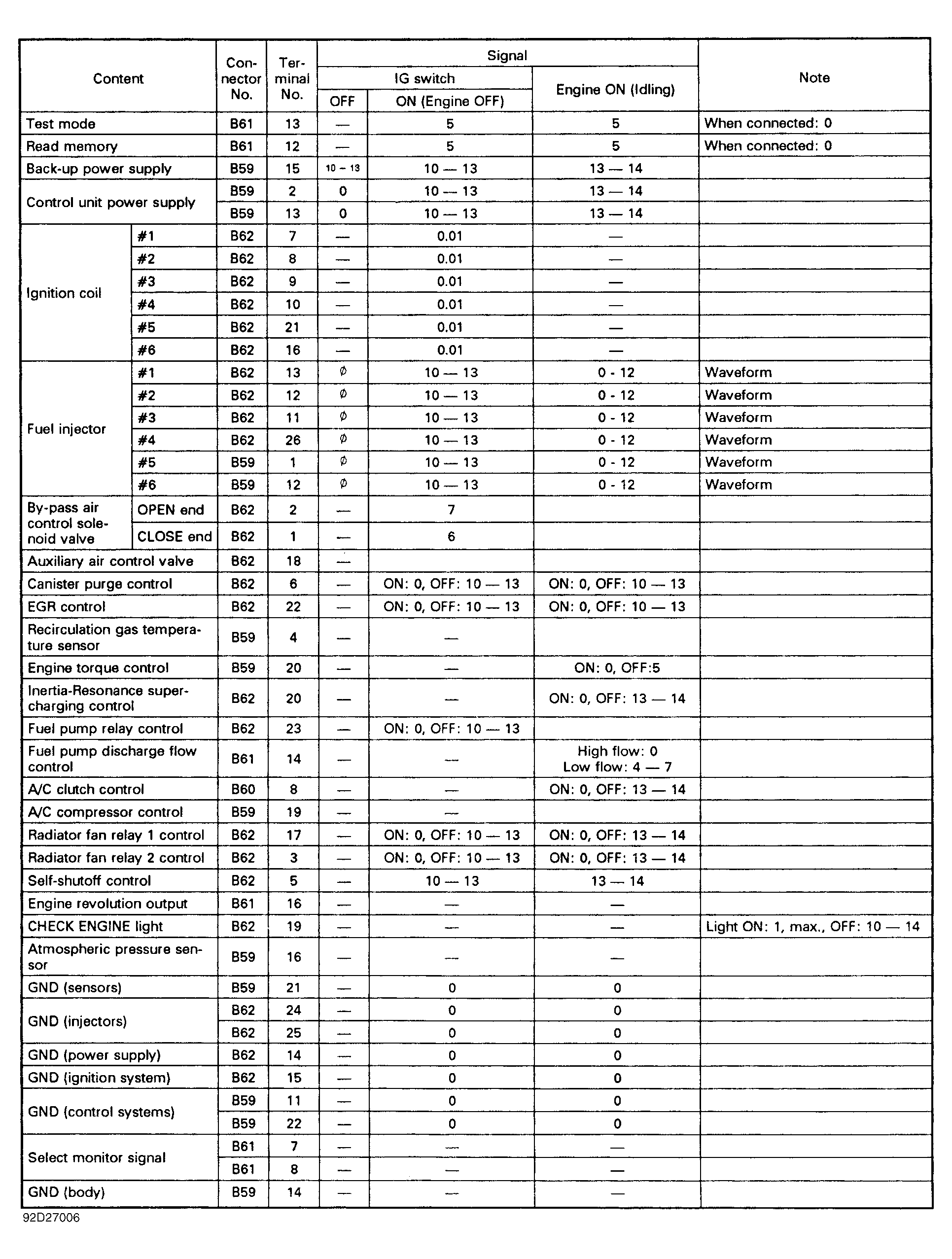 - ECU circuits are checked at ECU connector under one or more of the following conditions: ignition off, ignition on and engine off, or ignition on and engine running.