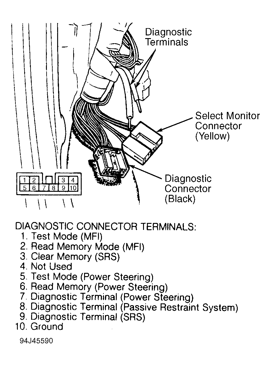- Enter specific test mode by connecting or disconnecting read memory and/or test mode connectors as shown in the RELATIONSHIP BETWEEN MODES & CONNECTORS table. Connectors are located behind left side of instrument panel. See Fig 1