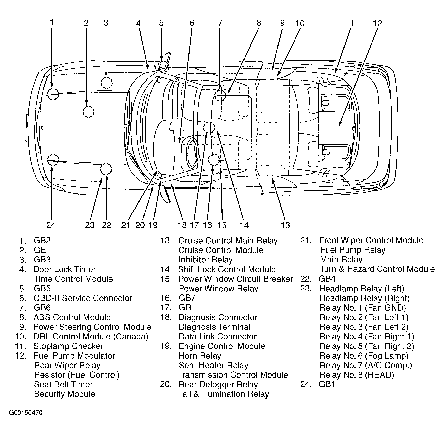 | DRL Control Module (Canada) | Behind trim panel, right of rear seat. See Figure . |