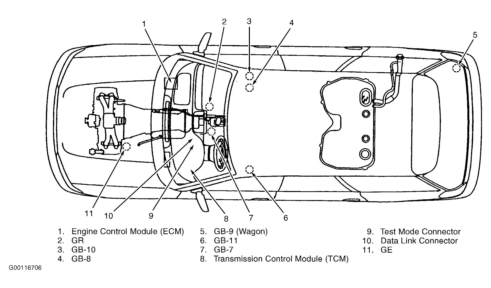 | Transmission Control Module (TCM) | Behind left side of dash. See Figure. |