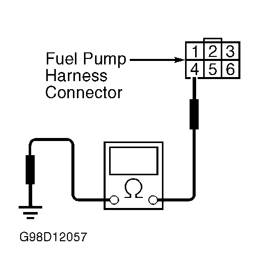 Turn Ignition switch off. Disconnect connector from fuel pump. Check resistance between ground and fuel pump harness 6-pin connector terminal No. 4. See Fig 1. If resistance is less than 5 ohms, go to next step. If resistance is more than 5 ohms, repair open in fuel pump ground circuit. See appropriate wiring diagram in WIRING DIAGRAMS article in this section.