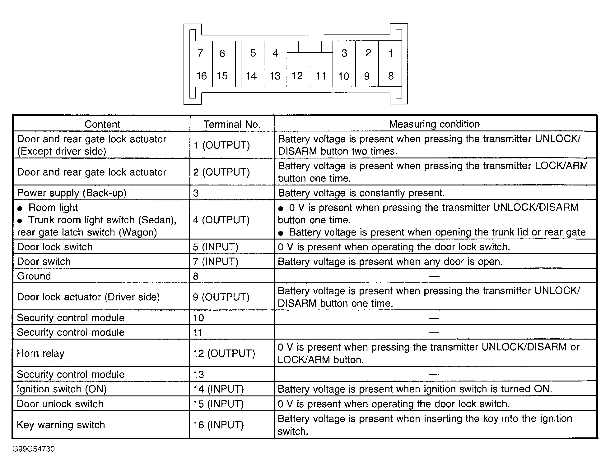 Home >> Subaru >> 2000 >> Outback Base, Automatic >> Repair and Diagnosis >> Body & Frame >> Door Locks >> Anti-Theft & Keyless Entry Systems >> System Tests >> Keyless Entry Control Module Power & Ground Supply